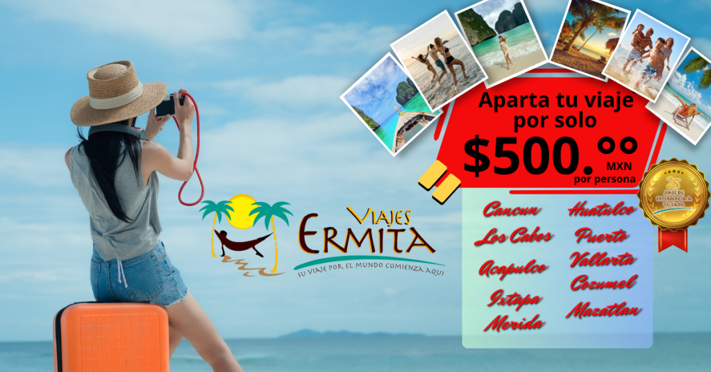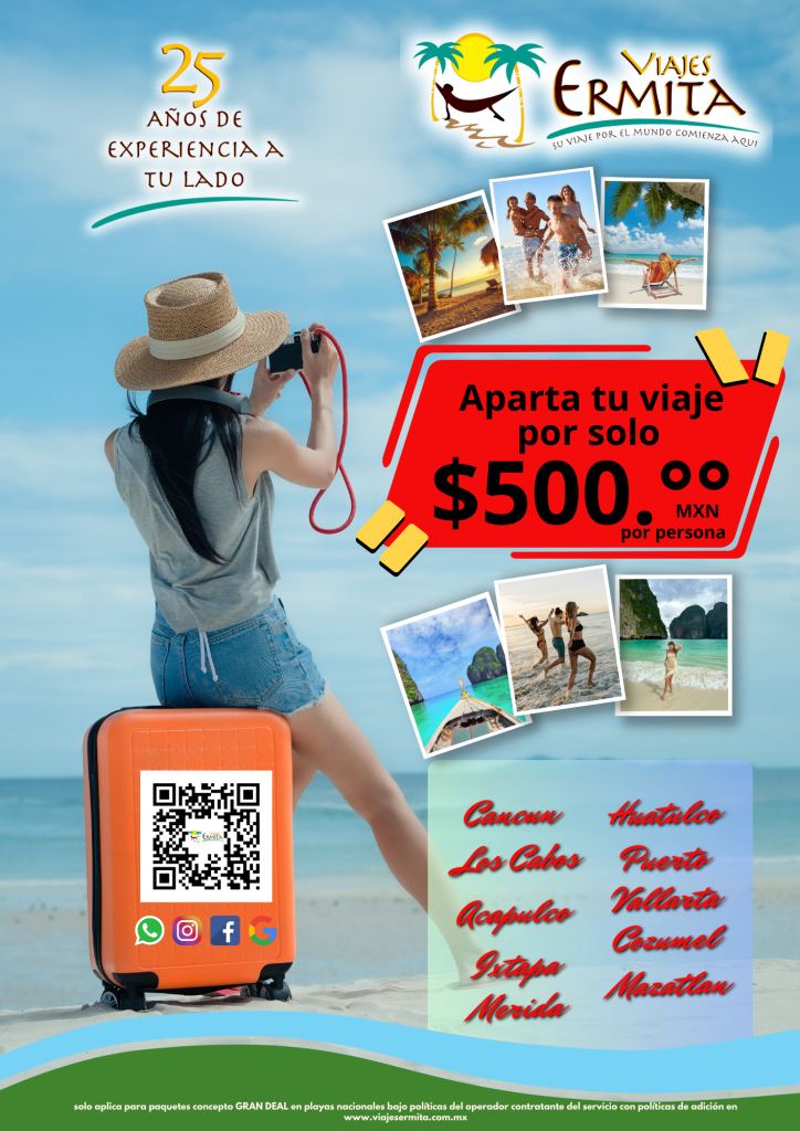No dejes pasar esta gran oportunidad aparta con 500 pesos por persona y paga poco a poco hasta 30 dias antes de tu viaje solo selecciona tu destino , fecha y hotel para nuestras playas nacionales esta promocion aplica para viajes nacionales 2025 y 2026 reservando antes de 31/10/2025 en paquetes “gran deal”